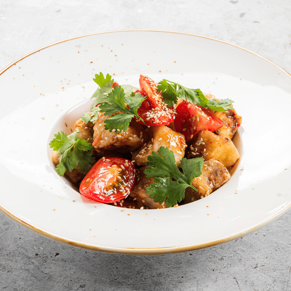 Золотистые хрустящие баклажаны, свежие листья салата и пикантный соус свит чили. Ярко, аппетитно и с ноткой остроты.