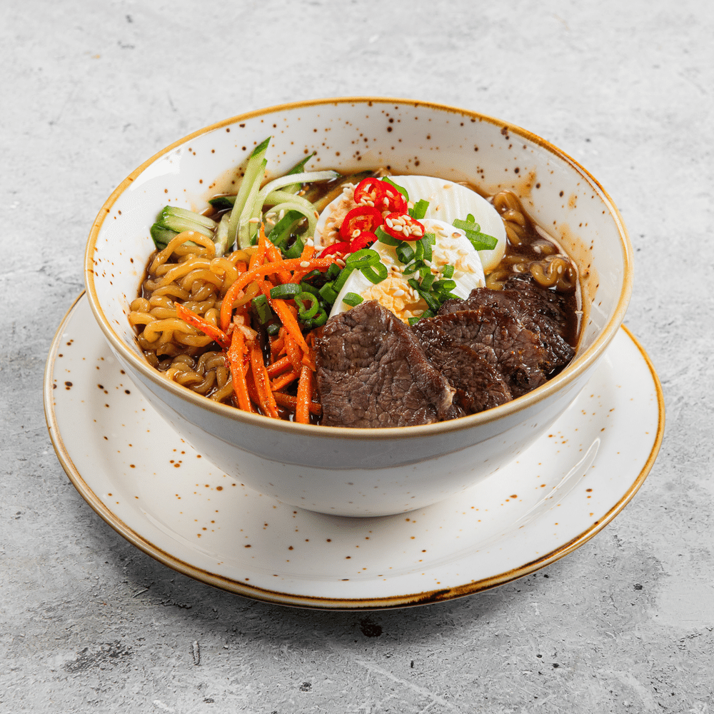 Горячий бульон с насыщенным вкусом, нежная говядина, свежая лапша и ароматные добавки.