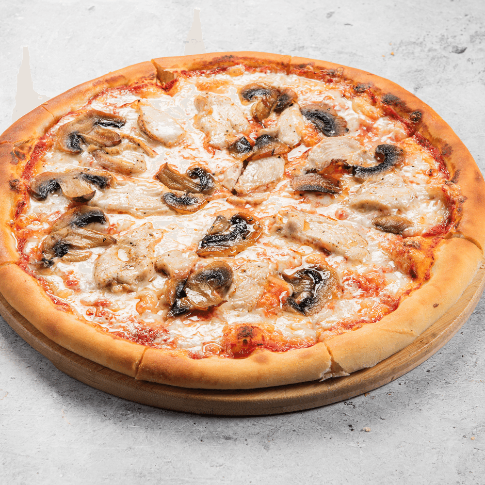 Пицца с грибами LM — тонкое тесто, томатный соус, моцарелла и свежие ароматные грибы с курицей. Классика, сочная и насыщенная вкусом.