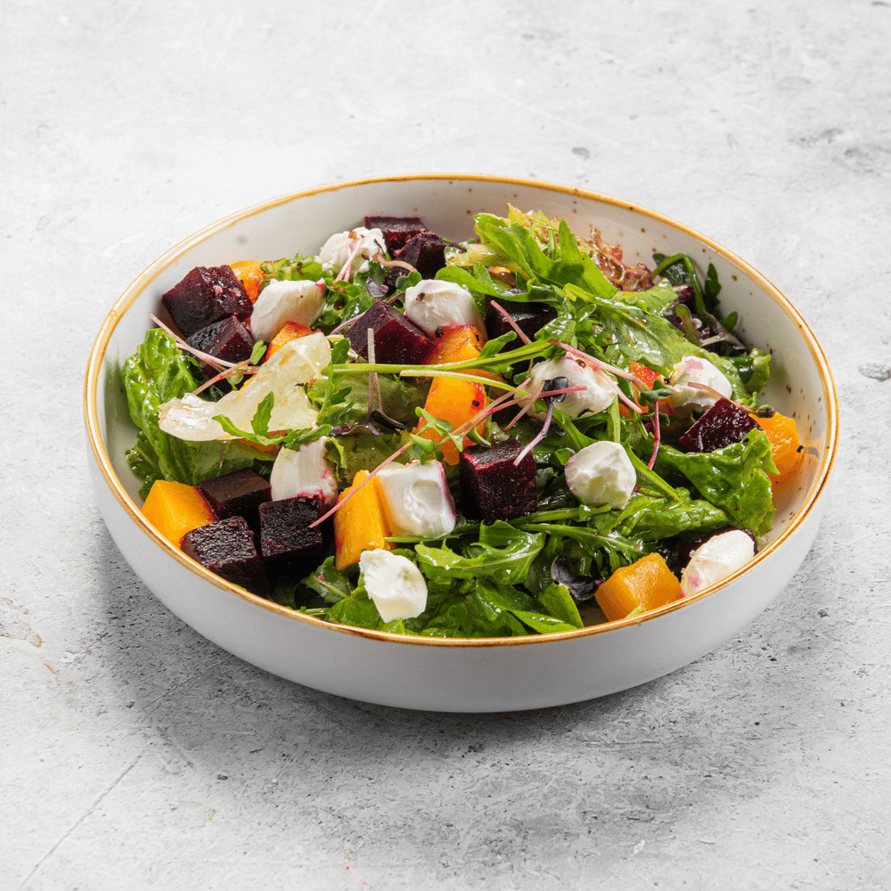 Салат со свеклой и рукколой LM — тонкая игра вкусов: сладость запечённой свёклы, благородная горчинка рукколы и лёгкая заправка, подчёркивающая естественную свежесть.