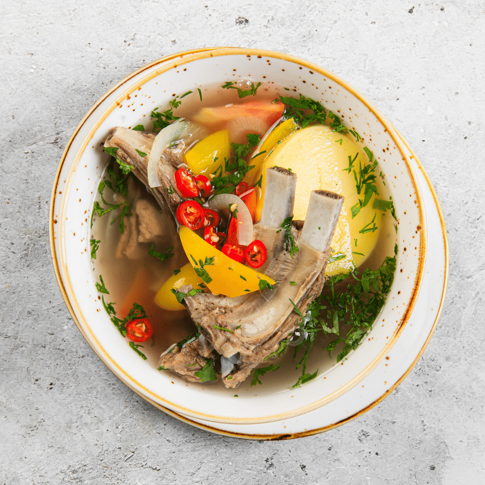 Наваристый бульон с мягкой бараниной, свежими овощами и ароматными специями.