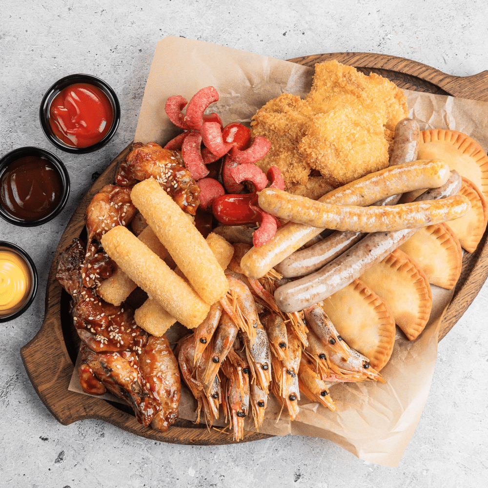 Сет La Maro LM — разнообразие горячих закусок: куриные наггетсы, чебуреки, крылышки, пивные креветки, сырные палочки, «кнут», охотничьи колбаски. Идеальный набор для компании