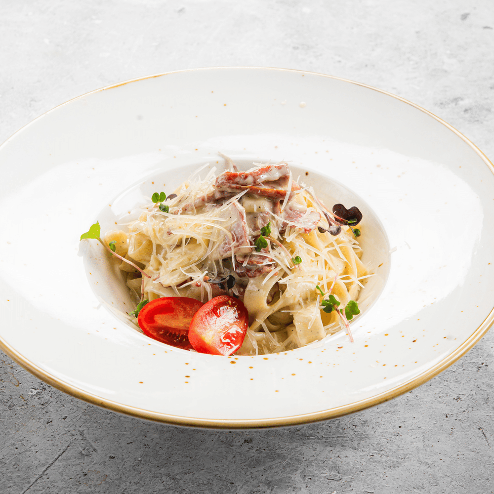 Паста Карбонара LM — нежная паста в сливочном соусе с хрустящим беконом и ноткой пармезана. Классика сытного итальянского вкуса, простой и безупречной