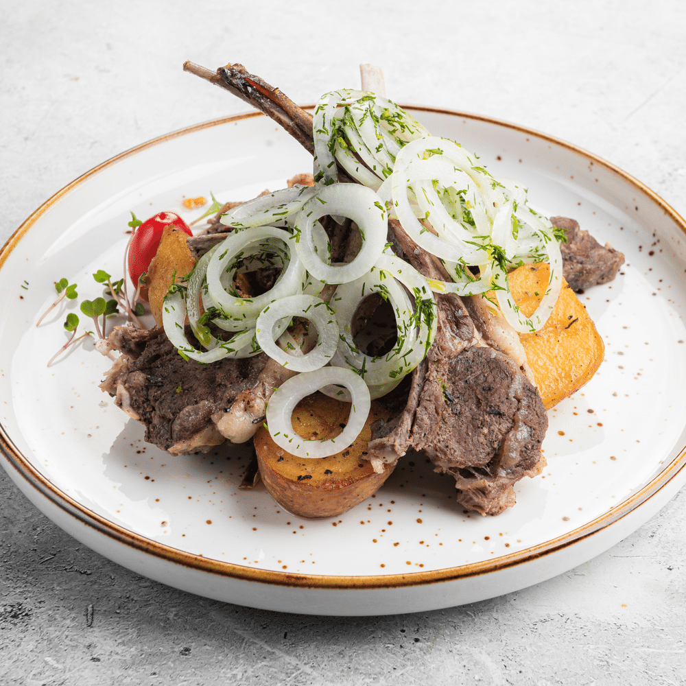 Сочный антрекот с характерным вкусом баранины, поданный с нежным картофельным гарниром. Сытно, изысканно и идеально сбалансировано.