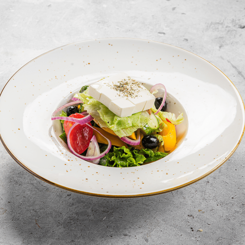 Греческий салат — свежие овощи, фетакса, зелёный микс, маслины и оливки под лёгкой лимонно-оливковой заправкой. Яркий и хрустящий