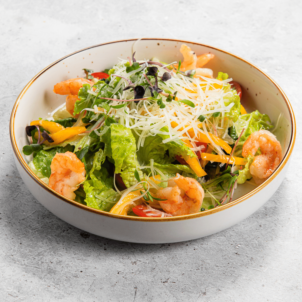 Салат с креветками LM — свежие листья салата, обжаренные креветки и тёртый пармезан. Лёгкое, изысканное и с морской ноткой в каждом кусочке.