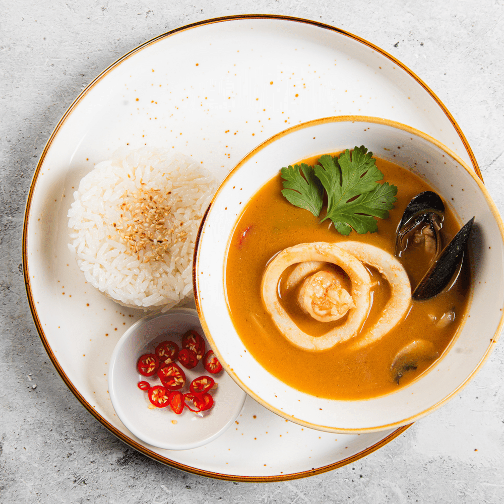Пряный и ароматный бульон с яркими морскими деликатесами, лёгкой кислинкой и нотками остроты. Креветки, мидии, кольца кальмара, лемонграсс, листья лайма, галангал, помидоры черри, рис
