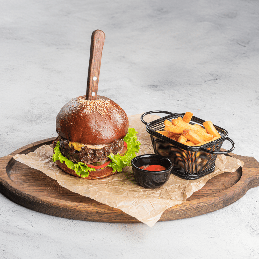 Бургер классический с фри LM — сочная котлета, свежие овощи и тёплая булочка, поданные с хрустящей порцией картофеля фри. Простая классика, которая всегда радует вкусом.