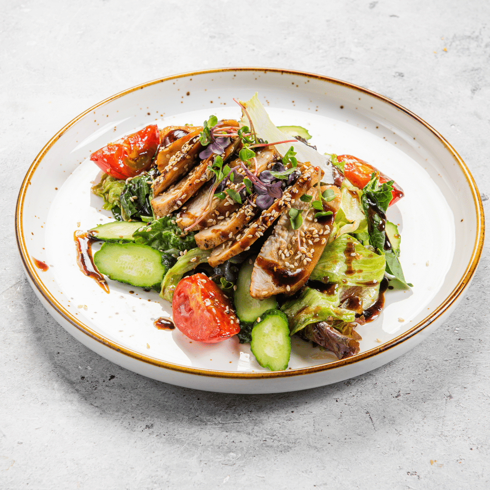 Салат с курицей в соусе Терияки LM — сочная курица в ароматном терияки, свежие листья салата и хрустящие овощи. Идеальный баланс сладости и лёгкости в каждой вилке.